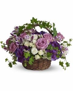 Las flores funerarias blancas y moradas, como la hortensia de color morado oscuro, las rosas lavanda, la alstroemeria morada, las rosas en espray blancas y la flor de cera blanca, se acentúan con una rica hiedra verde y un pitósporo abigarrado en una canasta natural con asa.
