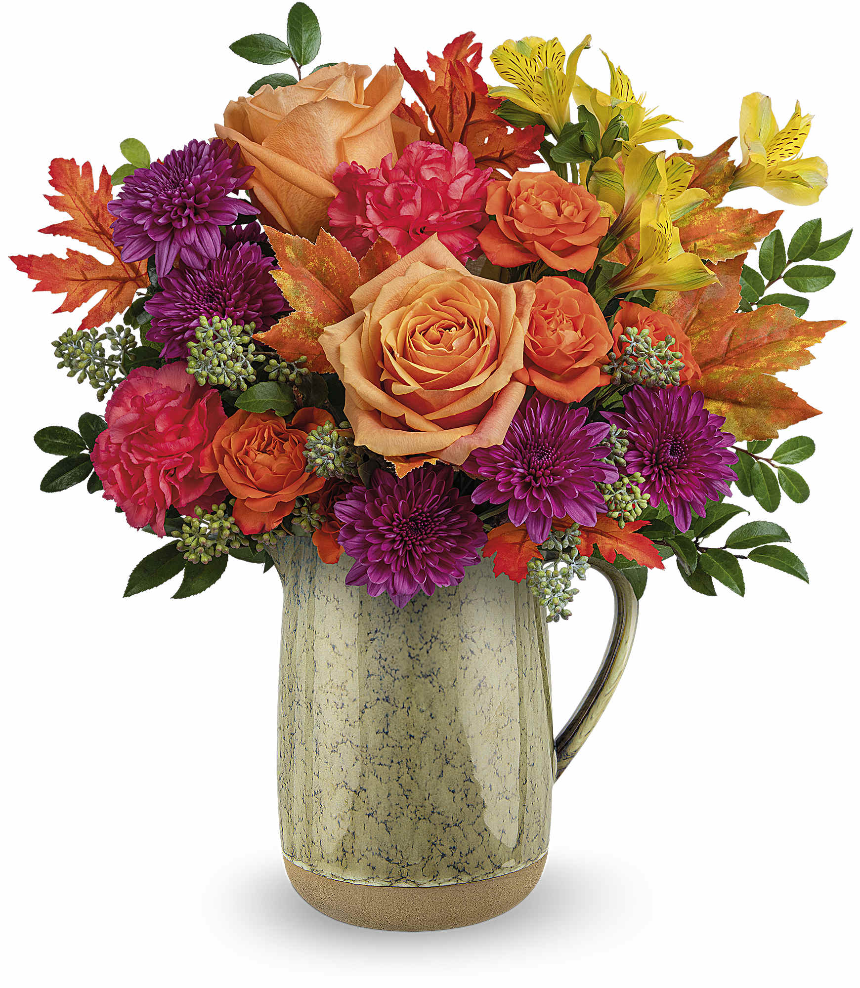 Celebre la esencia del otoño con este abundante ramo de rosas otoñales, ingeniosamente dispuestas en una jarra de cerámica esmaltada rústica.