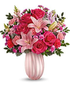 Captura el corazón de mamá con nuestro jarrón perlado Rosy Swirls de Teleflora, que irradia elegancia y encanto, combinado con un ramo de rosas rosadas y flores de lavanda, una deliciosa sorpresa para el Día de la Madre que atesorará.