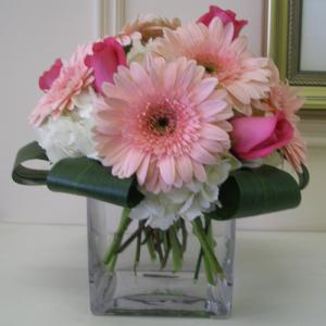 Ce vase carré de 6 pouces présente des hortensias blancs, des roses rose vif, des marguerites gerberas rose clair et des aspidistras pliés.