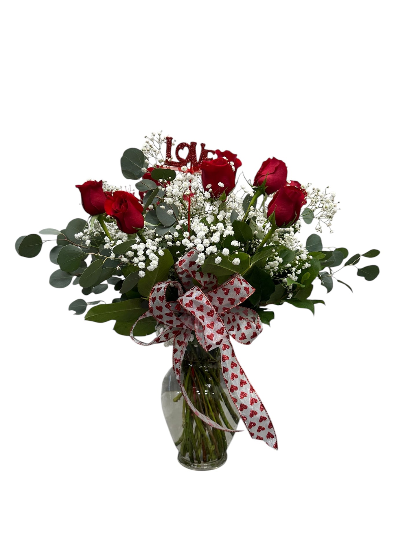 Un look classique 12 roses rouges à longue tige avec du souffle de bébé et des verts luxuriants accentués d'un cœur scintillant et de la Saint-Valentin