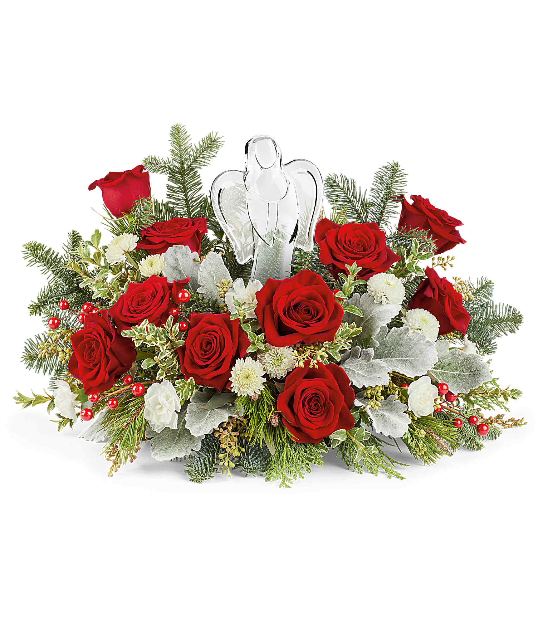 Celebrate the season with Teleflora's Joy to the World Bouquet. Featuring red roses, snowy white blooms, and festive evergreens, it's beautifully arranged around Teleflora's keepsake Crystal Angel-perfect for Christmas or a heartfelt holiday gift.