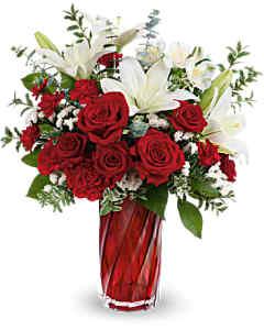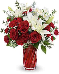 Capturez l'excitation du véritable amour avec ce vase en verre artistique tourbillonnant et scintillant, regorgeant de roses rouges rayonnantes et de lys blancs purs.