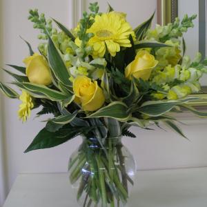 This bright arrangement features yellow gerberas, snap dragons, roses arranged with assortment of greens