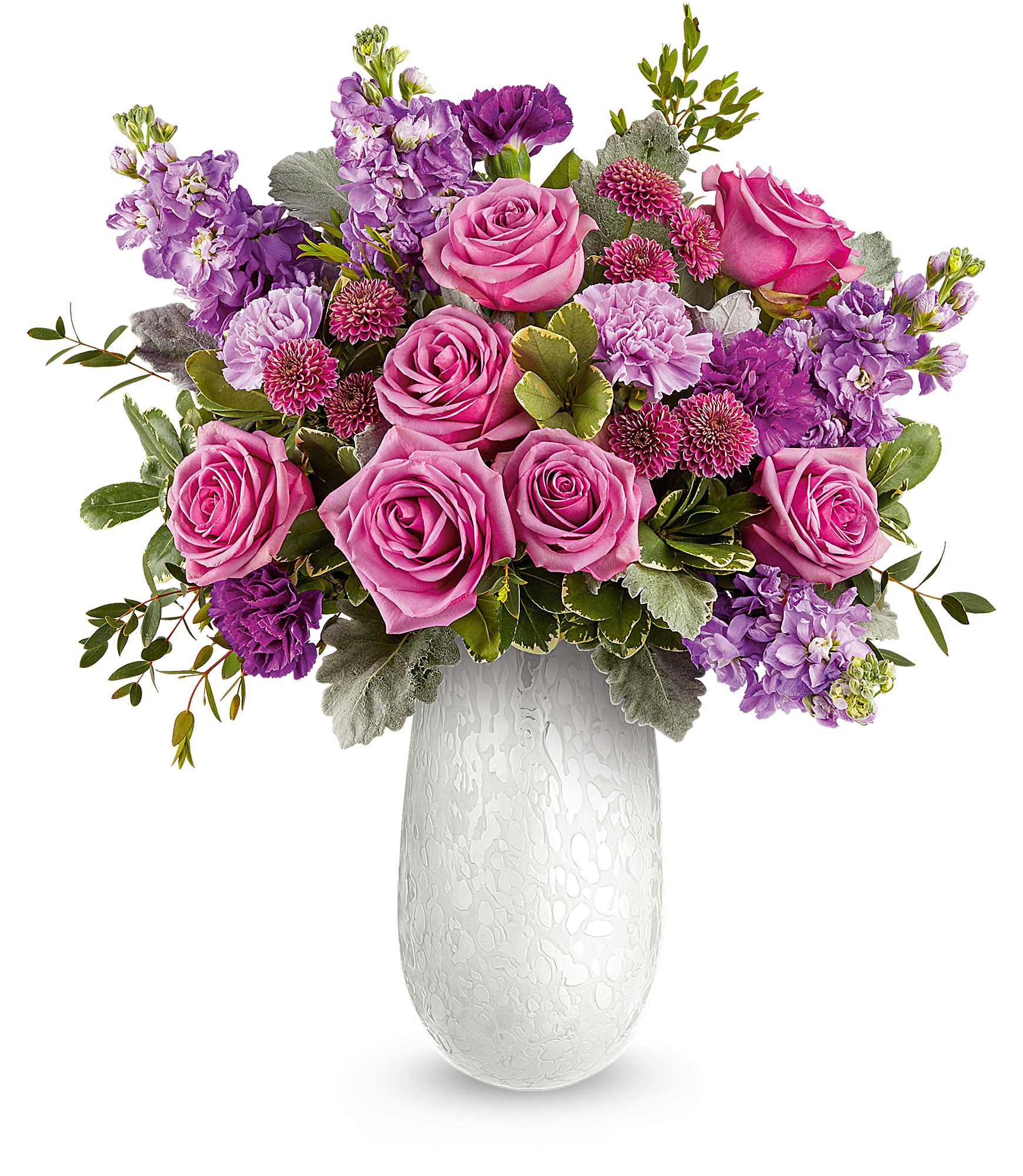 Delight Mom with Teleflora's Amelia Bouquet, a graceful mix of pink and lavender blooms beautifully arranged in Teleflora's Amelia Vase. This elegant art glass keepsake adds soft shimmer and a heartfelt touch to her Mother's Day.