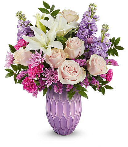 Add a touch of elegance and charm with Teleflora's Whimsical Blooms bouquet, presented in a stunning lavender mercury-inspired sculpted glass vase-a timeless centerpiece.